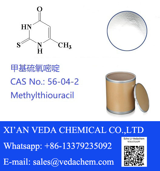 Properties: White to off-white powder. Therap-Cat: Thyroid inhibitor. Therap-Cat-Vet: Antithyroid substance to promote growth and finishing. Application: Antihyperthyroid. Why choose Xi'an Veda Chemical Co.,Ltd? 1) Over 15 years Methylthiouracil producing experience; 2) 99% purity assurance 3) Quick delivery: Large stock quantities to assure the delivery time